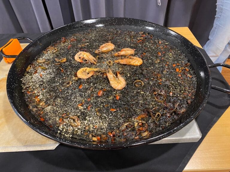 Genoten werd van de Salmorejo (koude tomatensoep), Pimentos del Piquillo (gevulde paprika‘s), Paella met kip, Paella met zwarte rijst en Torijas.