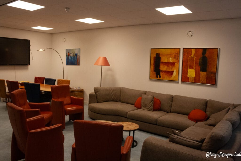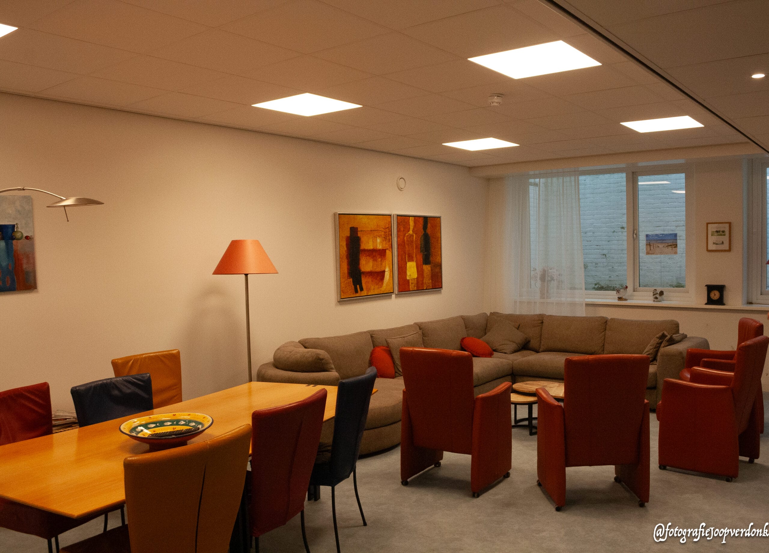 Zaal in het souterrain. De huiskamer is speciaal bedoeld voor groepen die baat hebben bij een kleinschalige, gezellige, huiselijke omgeving om zich prettig te kunnen voelen en zich gemakkelijker te kunnen uiten, zoals lotgenotengroepen en kleinschalige gespreksgroepen. De ruimte is niet bedoeld voor recepties en borrels. Zaal met keukenblok en verschillende tafels en stoelen, in huiskamer sfeer!